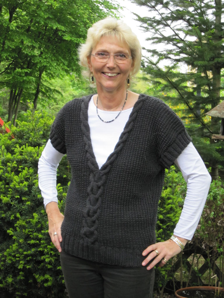 der Pullunder mit dem Zopf in der Mitte steht Dir ausgezeichnet.