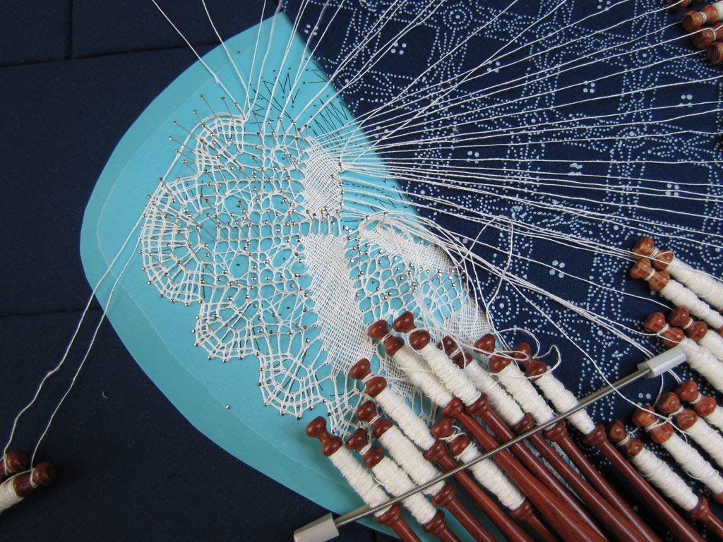 Ich mag solche Klöppelarbeiten ja sehr gern sehen, aber bei den vielen Fäden die da in alle Himmelsrichtungen ausgestreckt sind, da komme ich schon allein beim hinsehen durcheinander……. ggg.