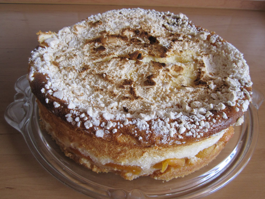 Käsekuchen mit Aprikosen und zerbröseltem Baiser.