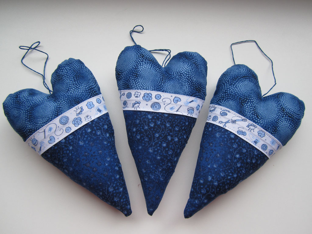 Eigentlich wollte ich heute Vormittag nur schwarzes Nähgarn im Stoffladen kaufen, aber dann ist mir u.a. dieses tolle blaue Band begegnet. Da musste ich doch glatt was mitnehmen und rasch diese Herzen nähen.