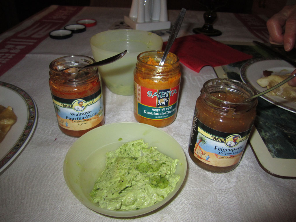 Und so ganz nackig wollten wir die auch nicht essen. Also hatten wir auch so einige Pasten gekauft: Knoblauch Chutney, Feigenpaste, Walnuss-Paprika-Paste. In den Tupperschüsseln war Bärlauchcreme.