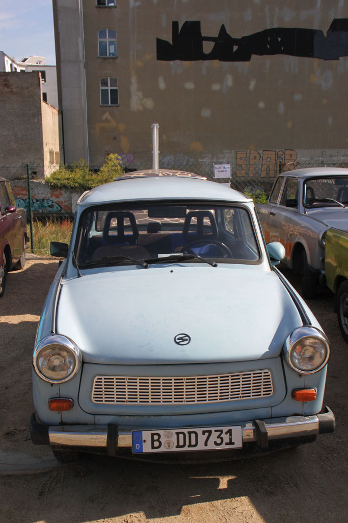 Und ein leibhaftiger Trabbi in der typischen hellblauen Farbe.