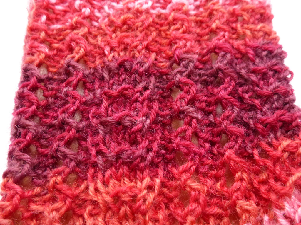 Ein gefälliges Muster, was aber auf der von mir gewählten Wolle nicht so gut rauskommt. Mehr unifarbend wäre besser gewesen. Aber die Farbe der wolle finde ich so klasse!