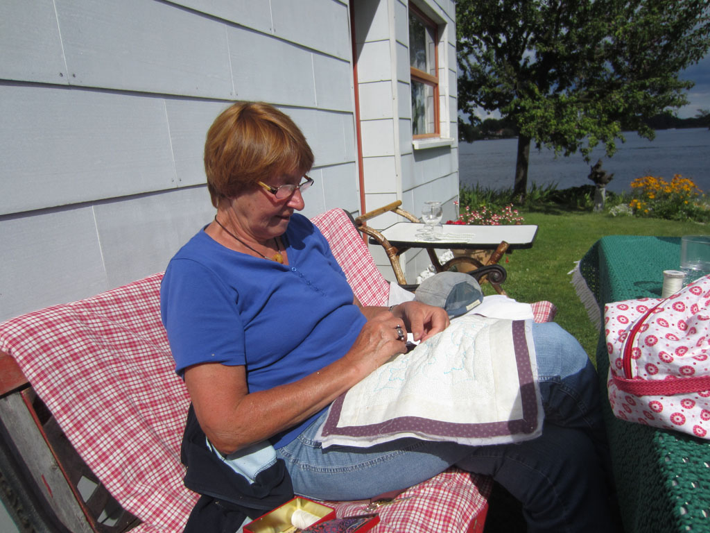 das sind ja tolle Bilder, die Du uns zeigst. Da kann ich verstehen, in so einem schönen Garten, dazu so wunderschön am See gelegen, macht das sticheln besonders viel Spaß. Und zum Abschluß noch Pflaumen pflücken, na, einfach toll.