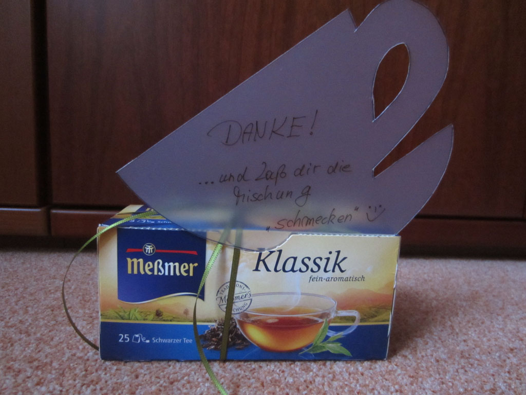 Und dann war ich ihr vor einiger Zeit in einer behördlichen Angelegenheit behilflich. Weil das ein so gutes Ende gefunden hat, hat sie mich mit einem kleinen Dankeschön überrascht. Das stand auf meinem Platz.