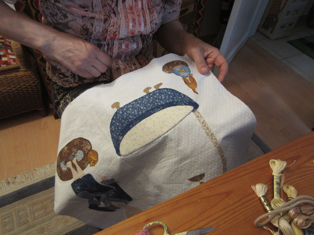 Birgit arbeitet an einem Wandbehang mit Hortensien.