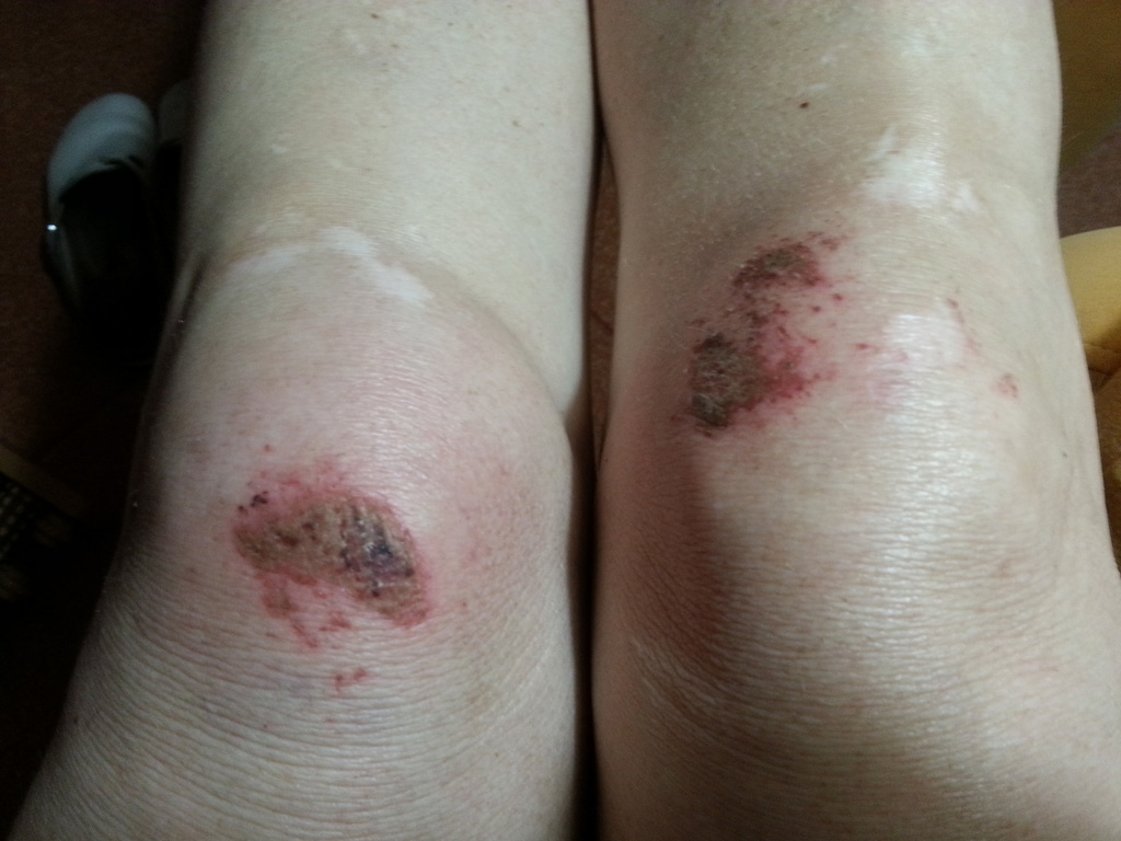 Hoffentlich heilen deine Knie schnell! Ich kenn das, wenn ich mal stolper und hinfall, habe ich entweder ne Bänderdehnung oder auch die Knie kaputt. Einfach so ist nicht ;).