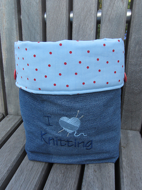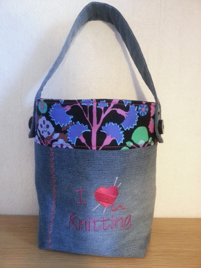 Von einer dieser Jeans habe ich zwei Projektstrickbeutel genäht.