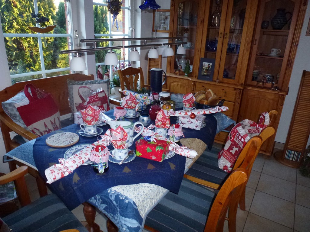 Christiane hatte den Tisch für unser Frühstück schön gedeckt. Leider kann man dies vor lauter Geschenken auf den einzelnen Plätzen gar nicht richtig sehen.
