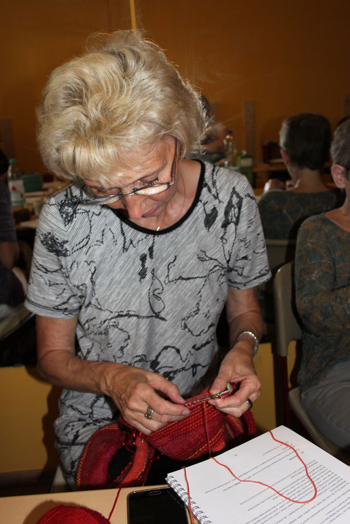 Wieviele Maschen da wohl gestrickt wurden :-)??? Liebe Marion, du trägst diesmal ja Grau – passt aber perfekt zu deiner roten Strickerei, sehr gut gewählt *lach*. Stricken in einer so netten Gruppe macht auch im Sommer Spaß, eure "Leiterin" hat euch auch gut im Griff, so konzentriert, wie ihr arbeitet :-). Die Ergebnisse sprechen wieder für sich.