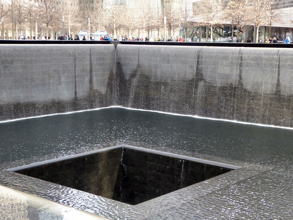 Genau dort, wo einst die Zwillingstürme standen, befinden sich heute zwei Becken. In die bronzefarbene Umrandung sind die nahezu 3000 Namen der Opfer eingraviert.