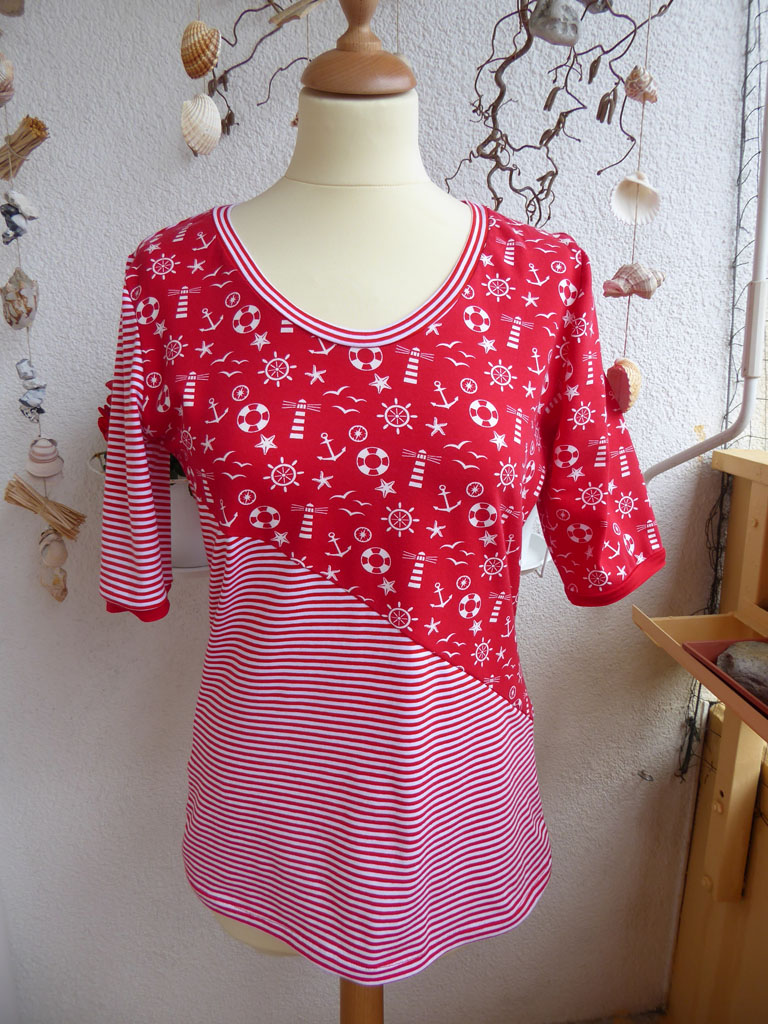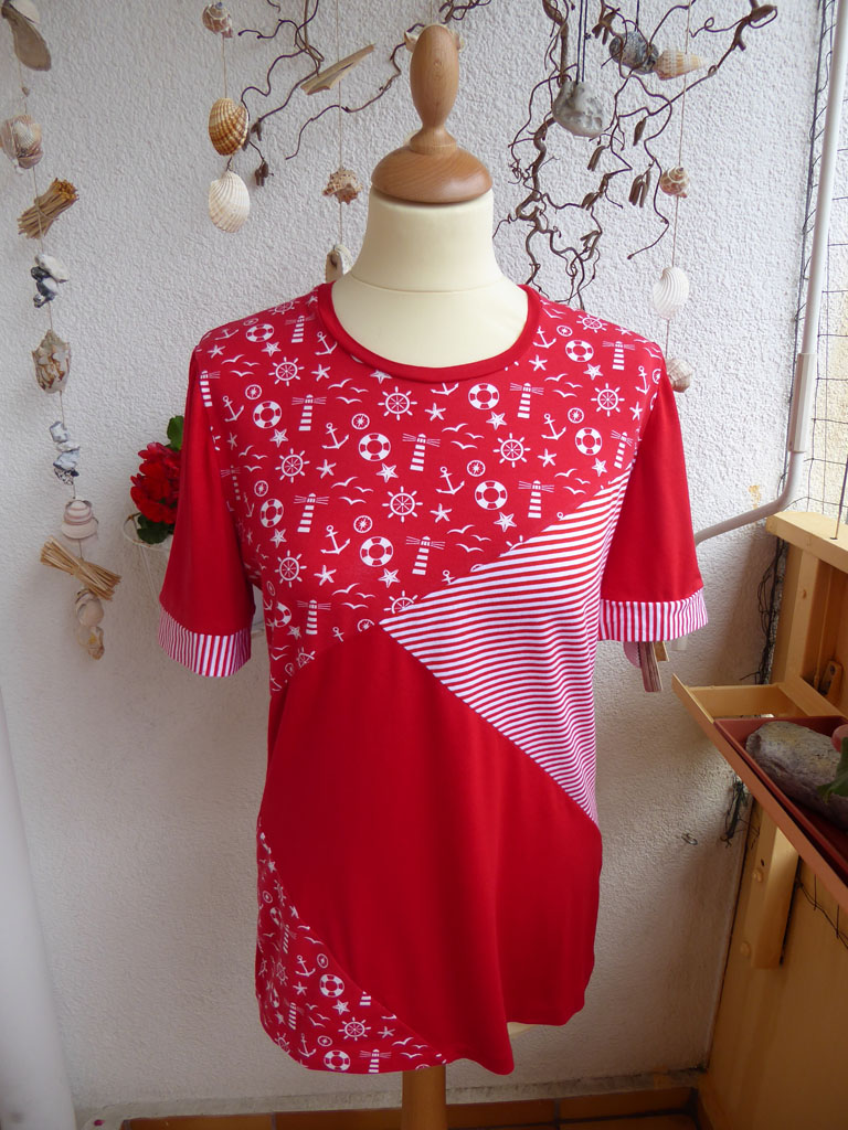 du hast recht, rot ist nicht nur im Sommer schön, obwohl mir deine Shirts doch sehr sommerlich vorkommen :-). Du hast aus einer Tunika zwei äußerst hübsche Shirts genäht, nun hoffe ich, dass die Sonne mitspielt und du sie bald ausführen kannst.