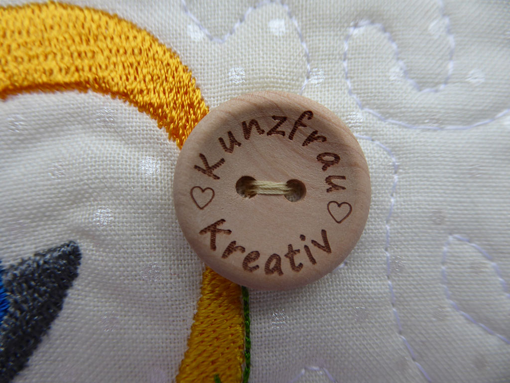 15. Das Loch kannst du mit dieser tollen Stickarbeit plus sehr schönem Quilting prima versteckt. Der Knopf ist echt stark.