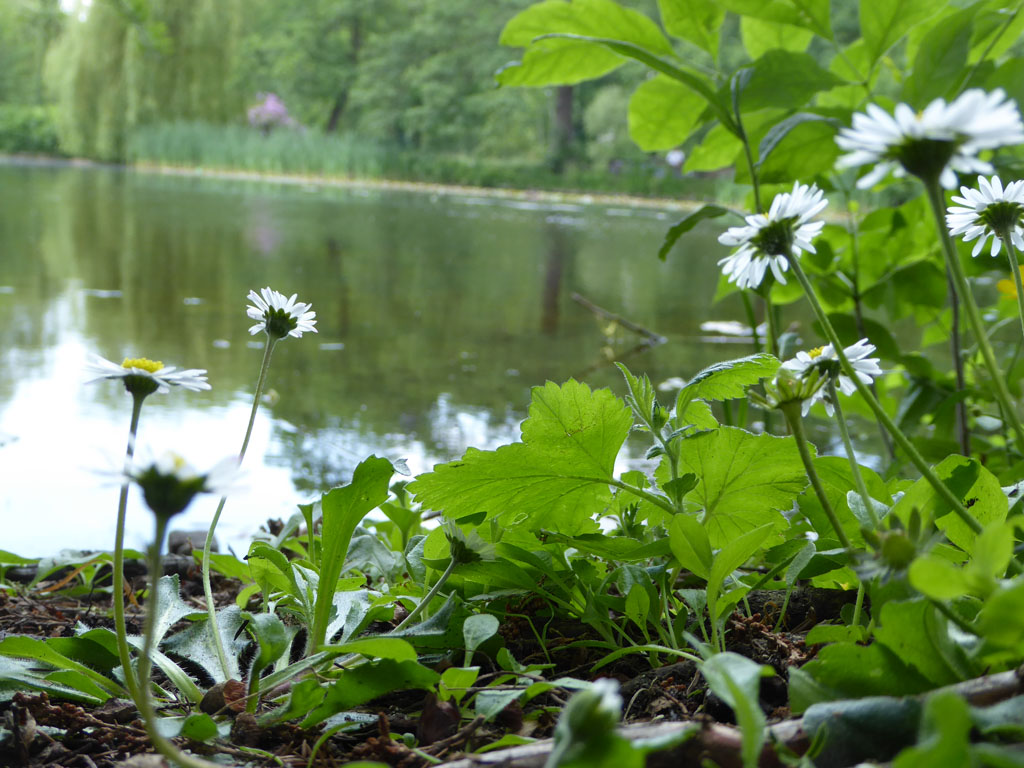 Und er staunte. Sogar da gibt es Wasser. Und so viel schönes Grün davor! Und Gänseblümchen!!!