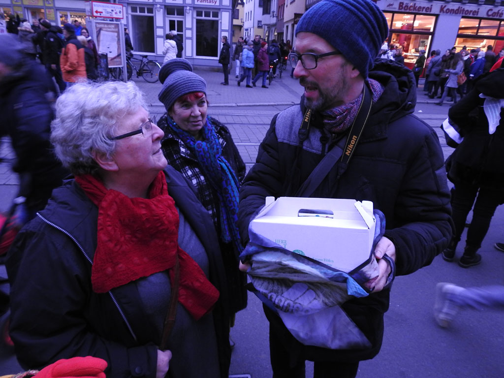 Durch die Stadt führte uns Anne, eine Strickerin der Erfurter Strickgruppe, die wir dann nachher zum Adventsfrühstück treffen werden. Sehr kurzweilig hat sie und mit viel Liebe ihre Stadt vorgestellt. Dafür gab es eine kleine Belohnung von Herrn U.