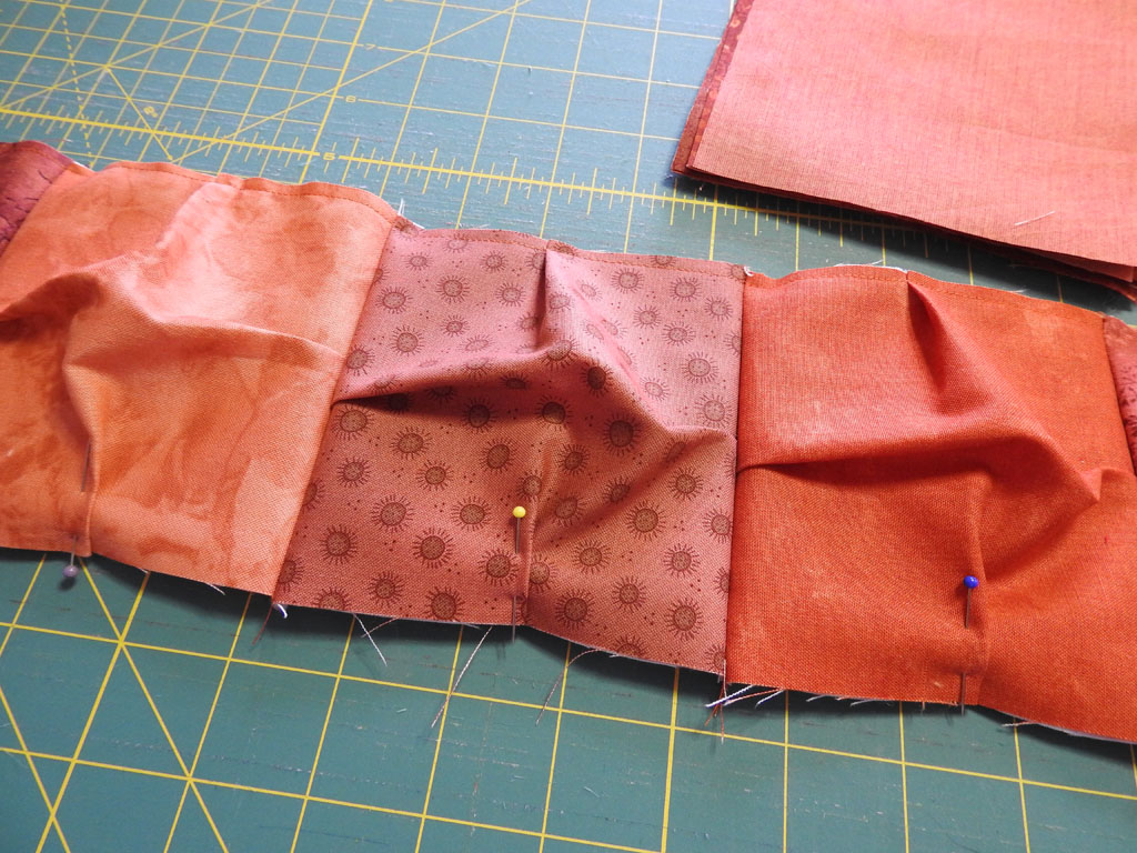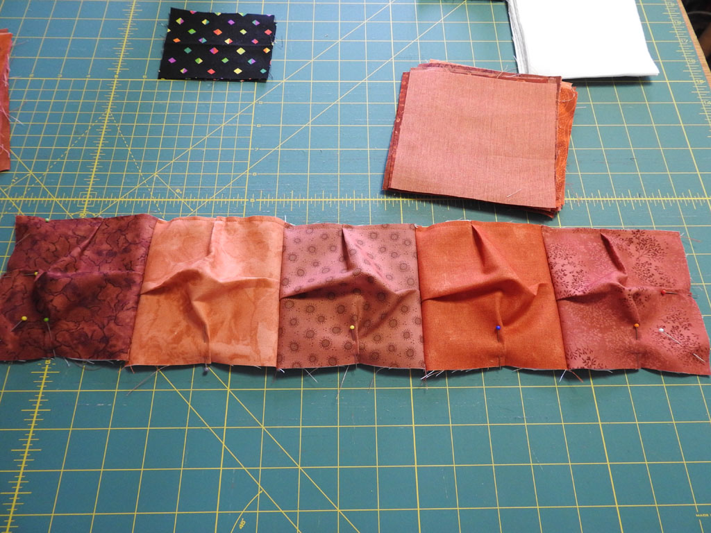 Birgit fällt fast in Ohnmacht. Sie hatte ihre erste Reihe fertig. Und da sie ihre Quadrate kleiner gemacht hat, musste sie 8 pro Reihe nähen.