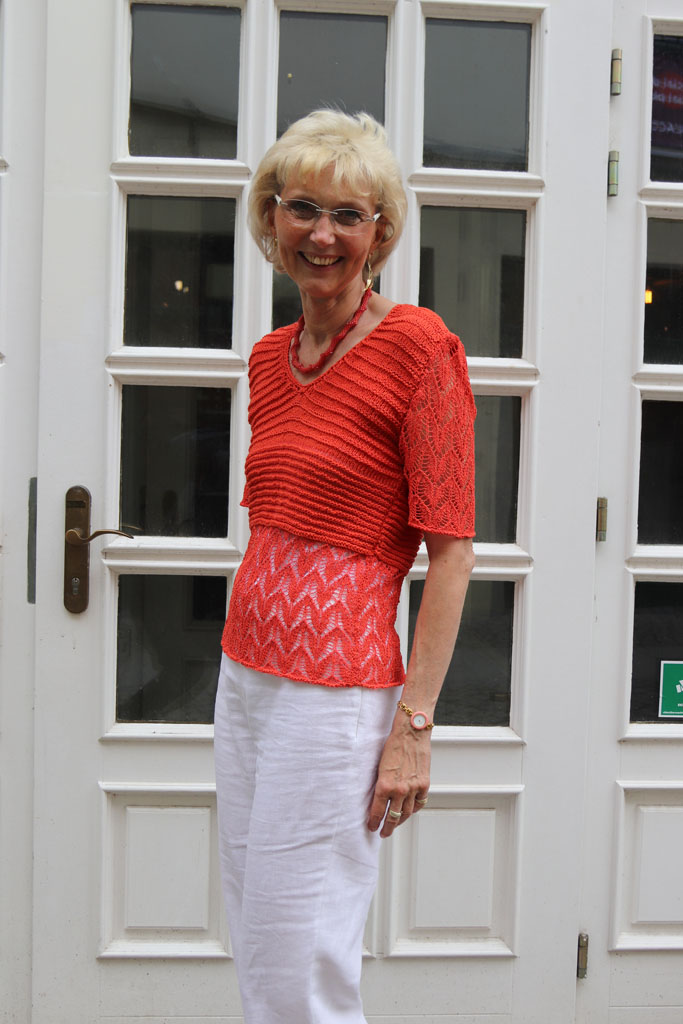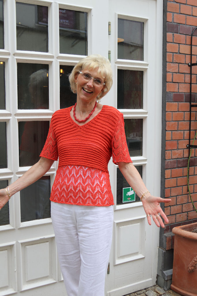 Rot und Weiß ist eine schöne und frische Farbkombination. Die Hose gefällt mir gut, aber Dein Pulli ist ein absoluter Traum! Ich finde ihn noch schöner als das Modell im Heft. Das zarte Ajourmuster in Kombination mit den kompakten Streifen ist klasse! Steht Dir super!
