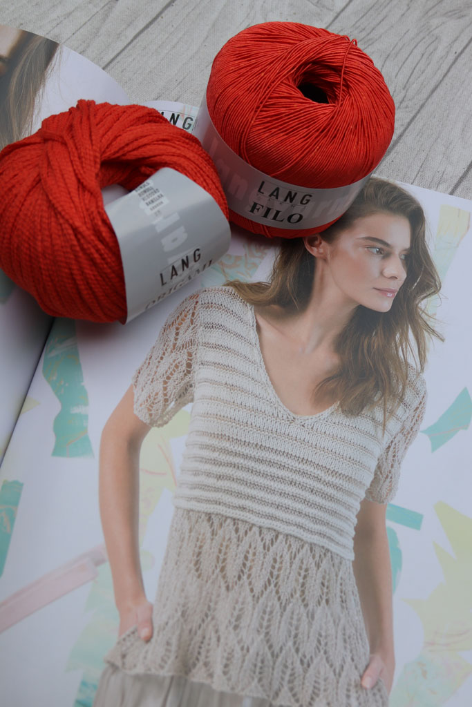 Entgegen den Materialangeaben im Heft, habe ich anstelle der Sol die Qualität Origami von Lang Yarns benutzt. Die passte einfach besser zu der von mir ausgewählten Farbe des Filo-Garns.