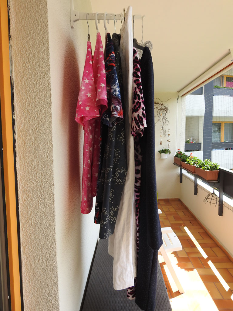 Frau Küstensocke zeigt zuerst ihre in den letzten zwei Monaten genähten Kleidungsstücke. Das mache ich dann auch mal. Leider besitze ich nicht so einen Kleiderständer wie Frau Küstensocke. Deshalb musste mein Haken auf dem Balkon herhalten. Und der reicht ja gerade noch!