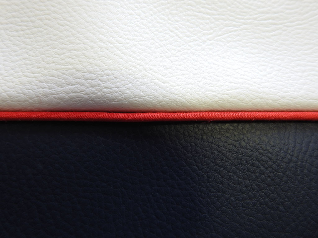 Schnell war die Außenhaut genäht. Unten blau, oben weiß, dazwischen rote Paspel.