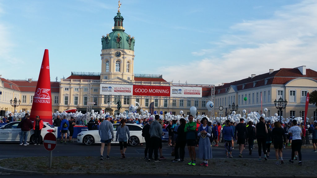 Als ich um kurz nach 9 Uhr am Schloss Charlottenburg ankam, hatten sich die meisten LäuferInnen schon eingefunden. Zu diesem Event kommen mal so locker 12.000 – 13.000 LäuferInnen.