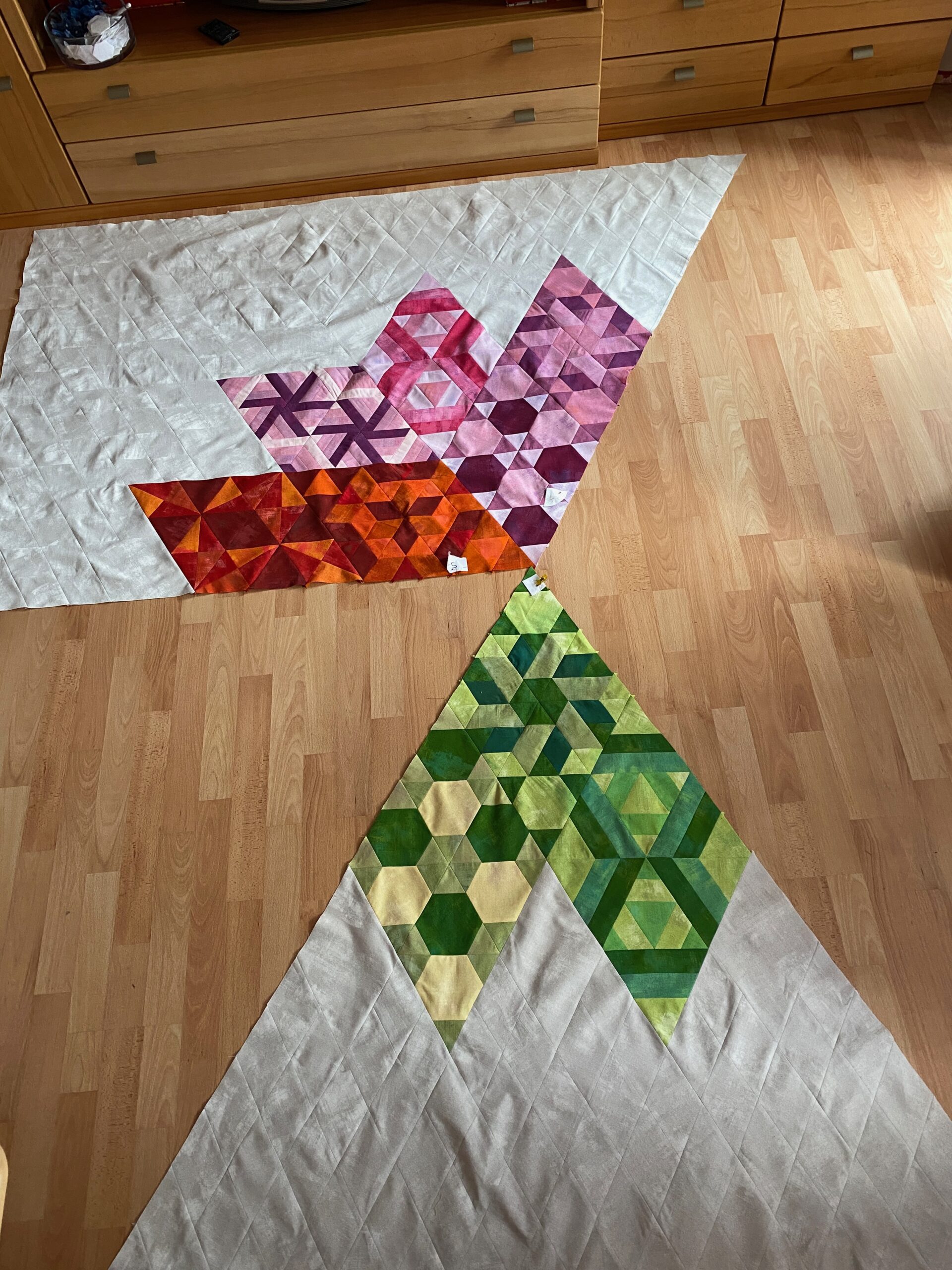Jetzt heißt es sich an den Hintergrund zu machen. Im Gegensatz zum Original werde ich den nicht in Abstufungen machen, sondern einfarbig. Dafür habe ich mir ebenfalls einen Grunge-Stoff gekauft. Ein zartes Hellgrau. Da ich nicht genau abschätzen konnte wieviel Stoff ich benötige, habe ich erstmal 4m gekauft. Leider haben die 4m nicht gereicht und ich musste nachordern. Aber ich hatte ja schon genug vorgeschnitten um anfangen zu können. Drei von sechs Sequenzen sind fertig.