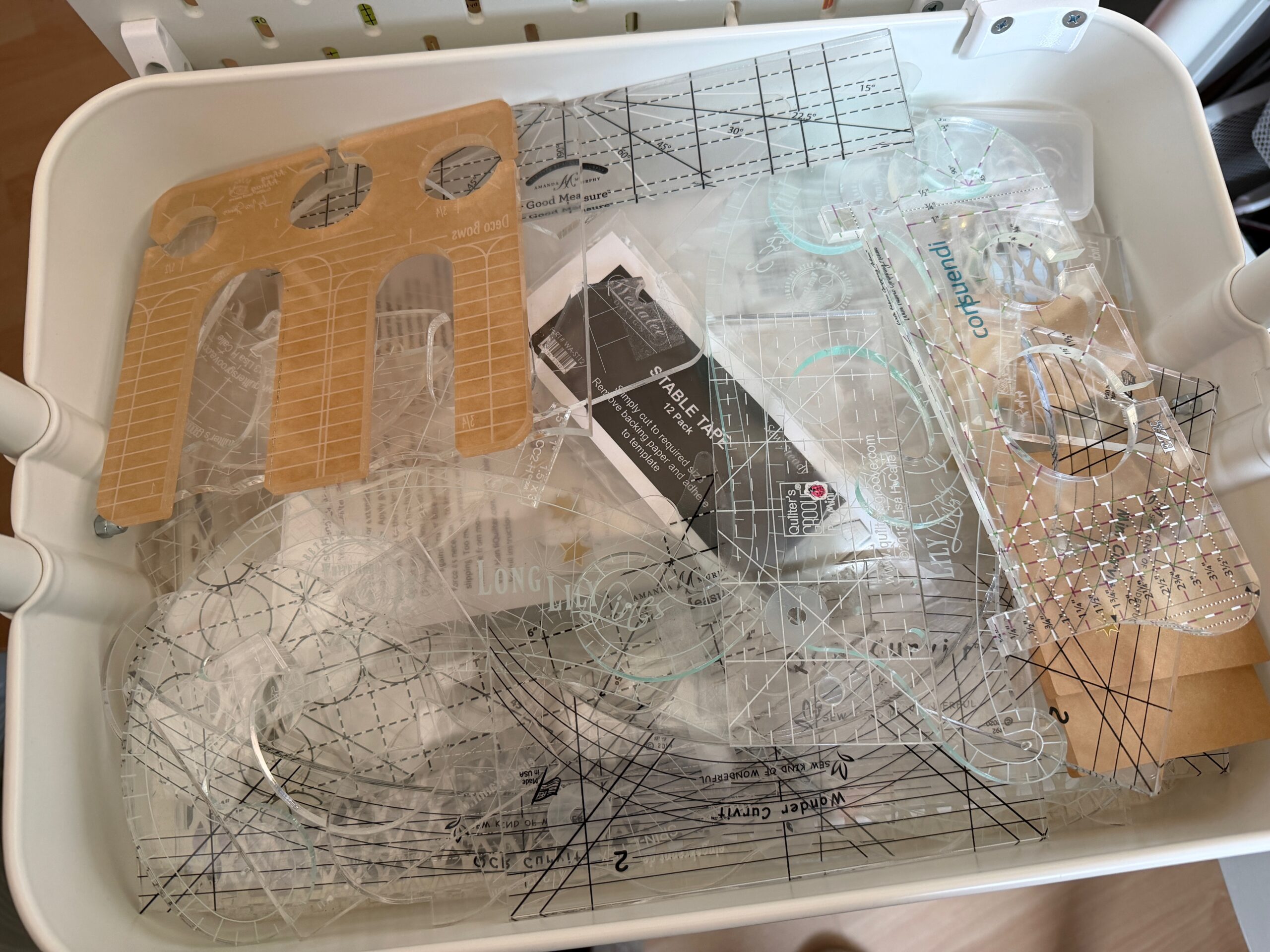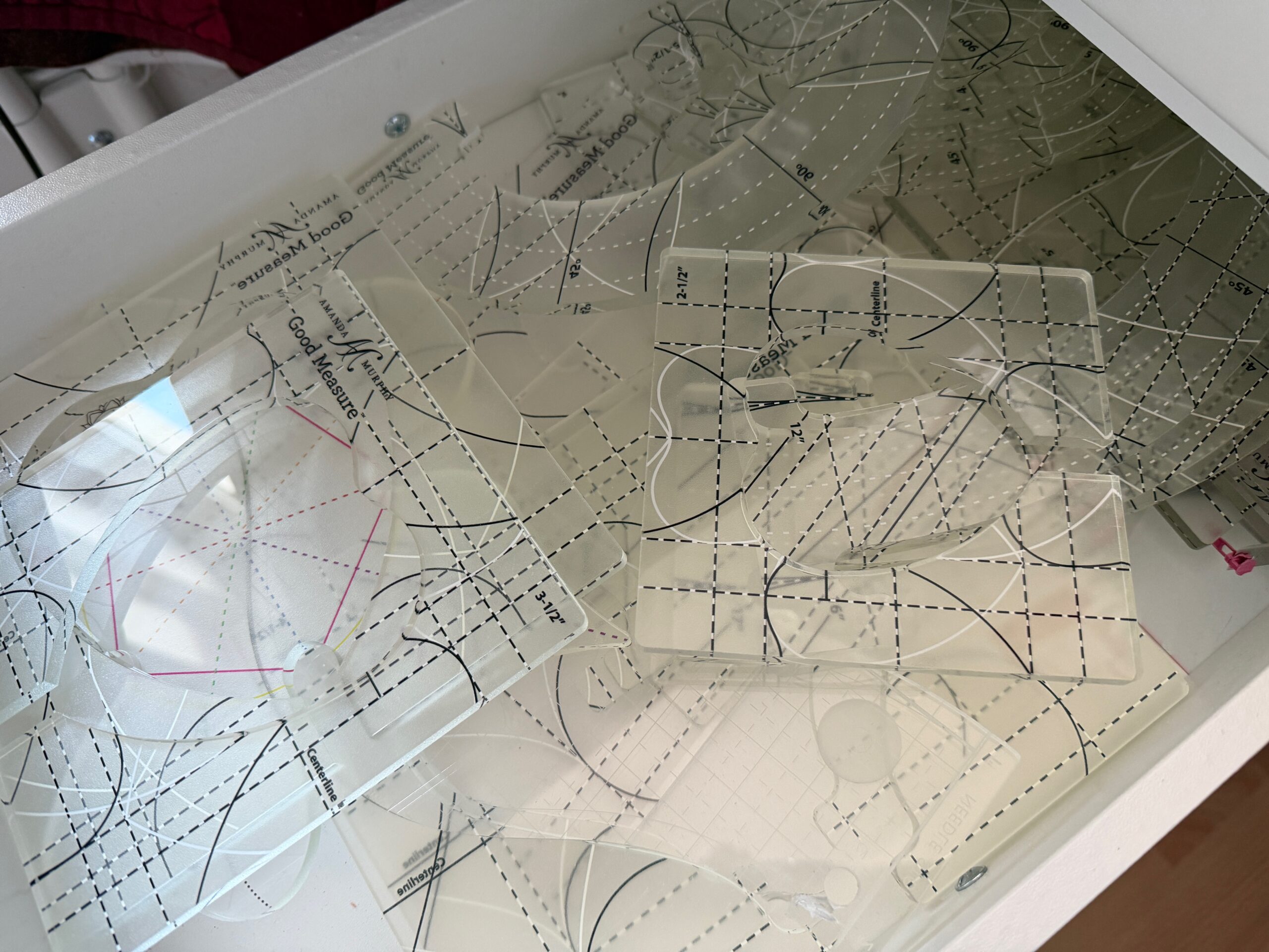 Inzwischen haben sich bei mir eine Menge an Rulern zu Quilten angesammelt. Einen Teil bewahre ich in einer Schublade auf ….