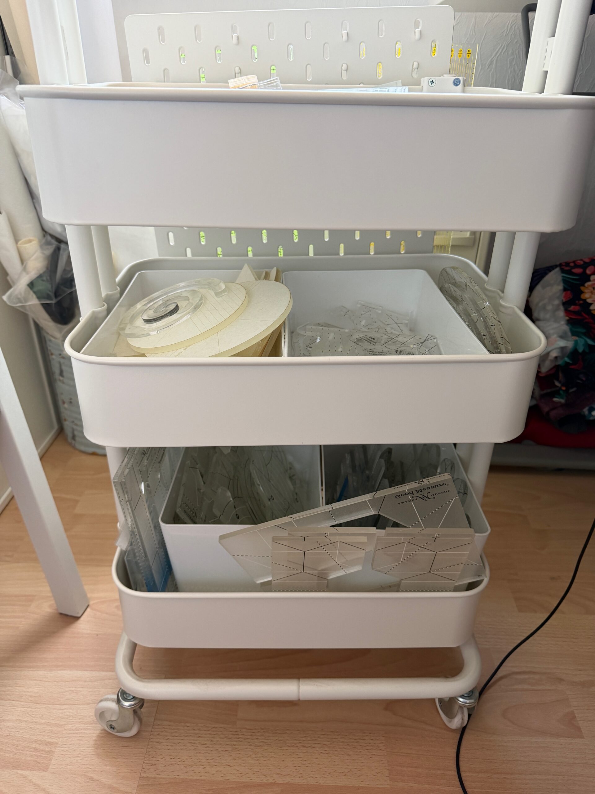 Richtig zufrieden bin ich damit nicht. Die Ruler im Wagen stauben doch sehr ein. So habe ich schon eine Weile vor mir Projekttaschen zu nähen. Aber eben nicht, um darin Projekte, sondern die Ruler aufzubewahren.