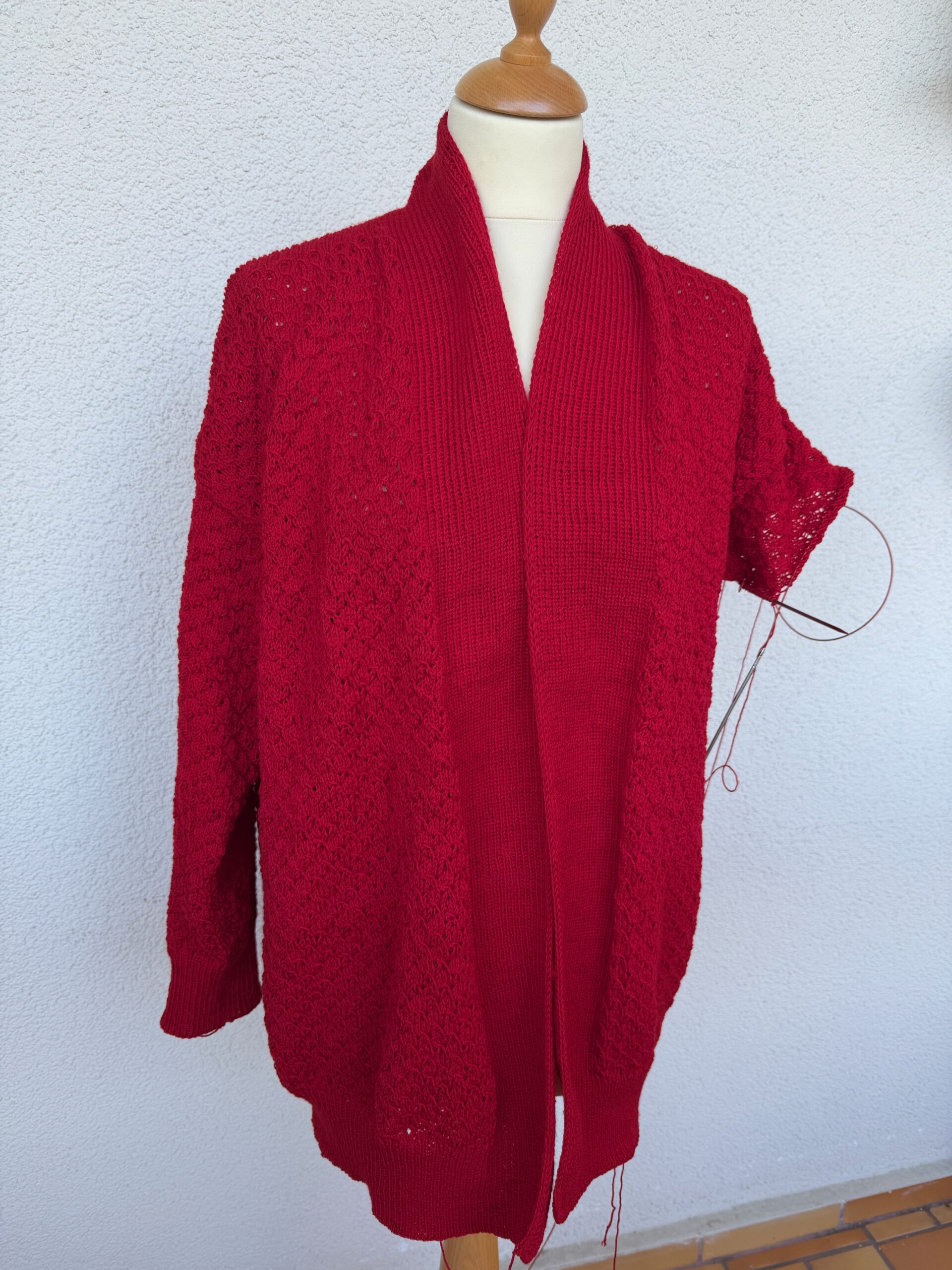 Ich hatte ja meine rote LongLove mit in den FJKA 2026 genommen. Es fehlten nur noch die Ärmel. Inzwischen ist ein Ärmel fertig und der zweite angefangen.