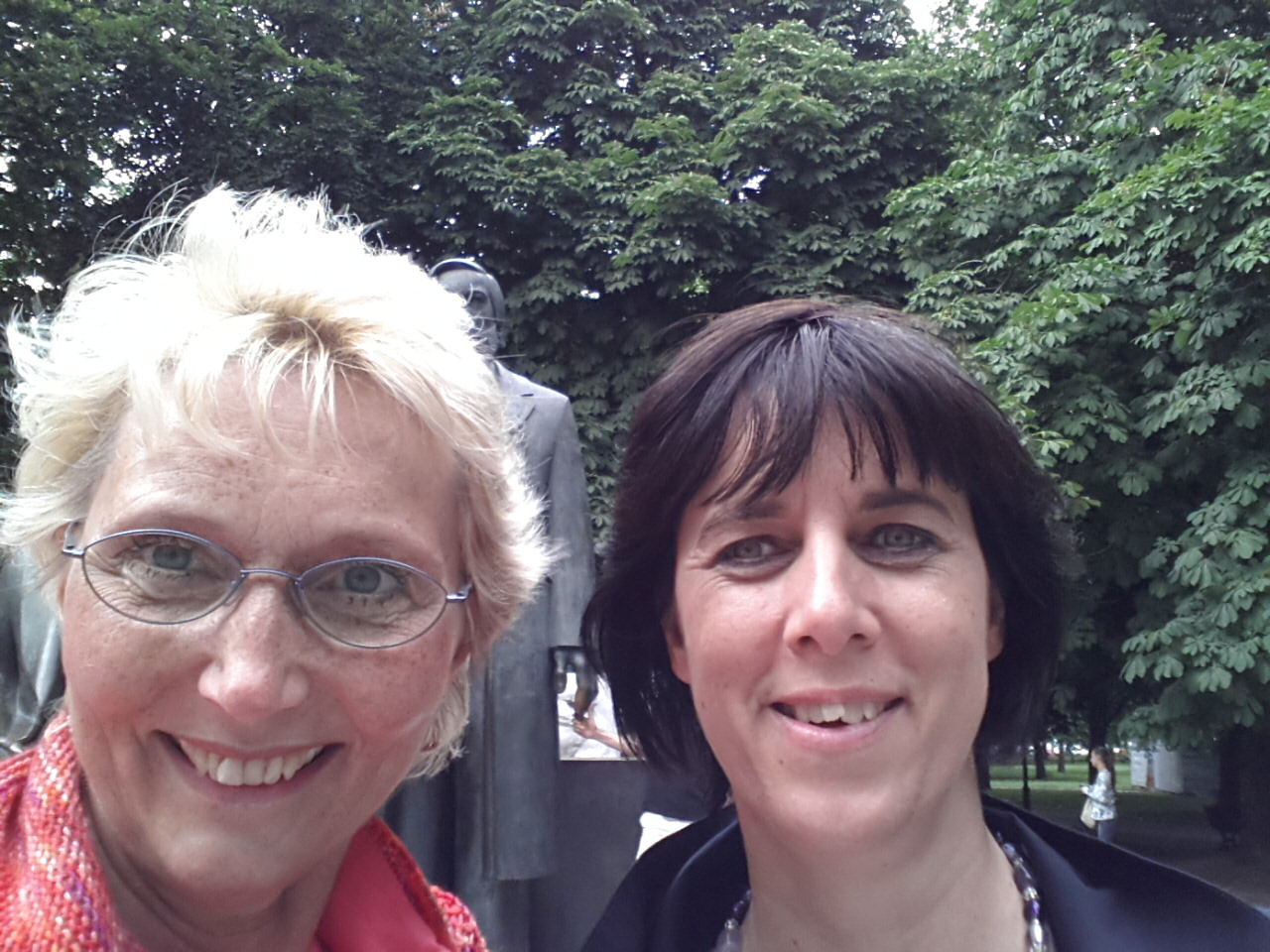 Auf dem Weg dahin trafen wir Marx und Engels. Eigentlich sollten die mit aufs Bild, aber das ist mit dem Handy gar nicht so leicht!