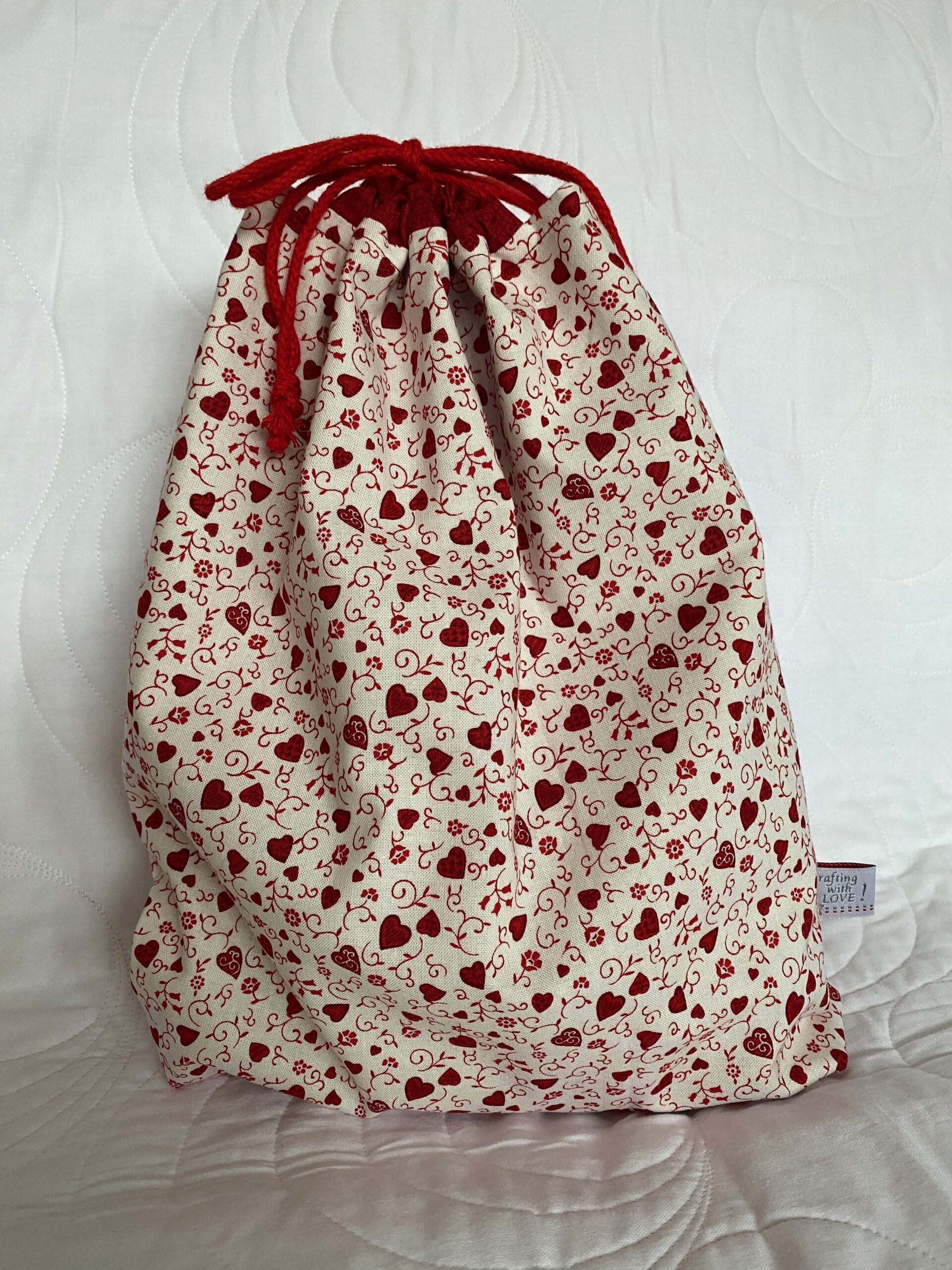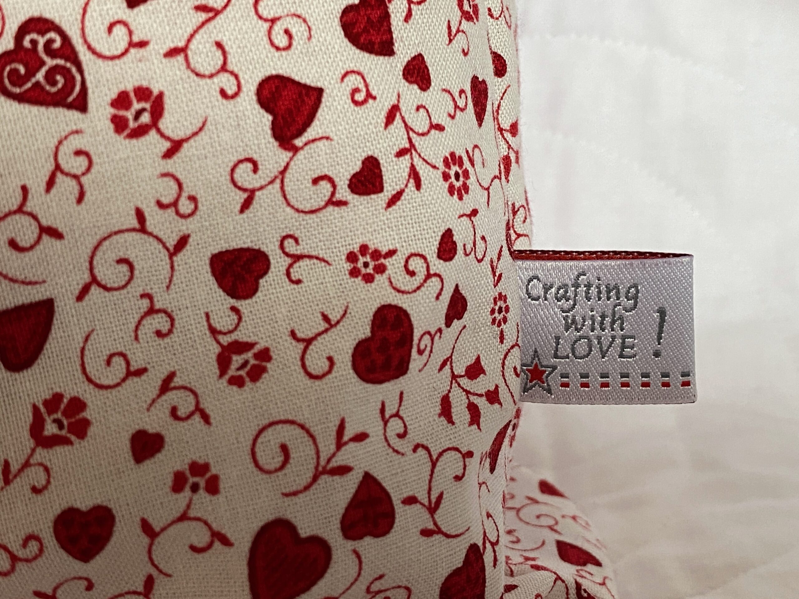 Als ich dann so durch meine roten Stoffe geschaut habe, fielen mir zwei Herzchenstoffe in die Hände. Ich gestehe, ich wusste nicht mehr, dass ich die habe. Aber nun waren sie perfekt. Also nichts mit applizieren oder FPP. Ganz einfach nur der Herzchenstoff.