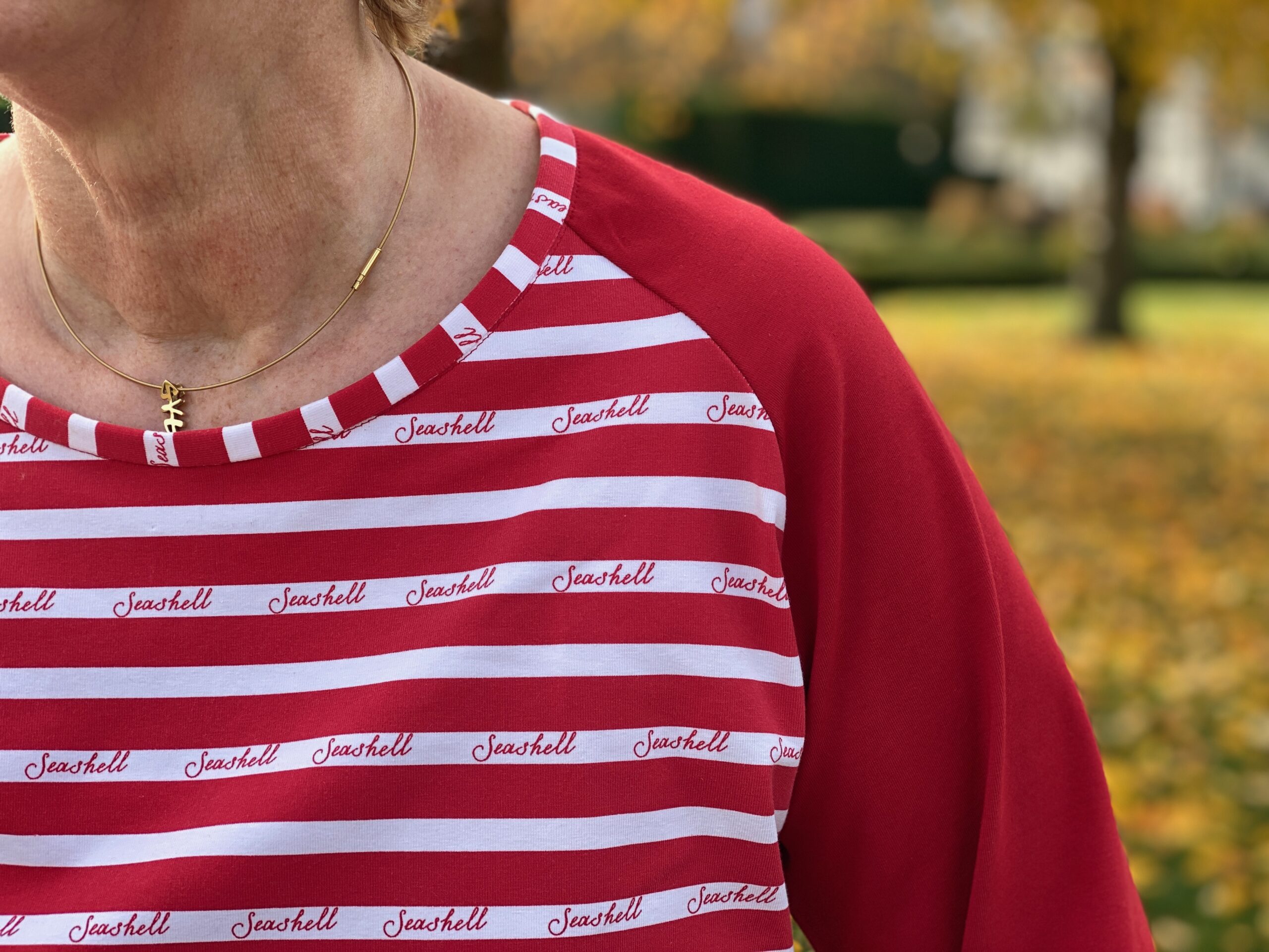 Nun aber zu meinem diesjährigen Shirt. Von einer Nähfreundin bekam ich kürzlich ein kleines Päckchen, aus dem ich auch auch einen Meter Stoff auspacken durfte. Rot/weiß gestreift mit einem maritimen Schriftzug. Kombiniert mit einem unifarbenen roten Jersey die perfekte Kombination für das Raglanshirt Combina.