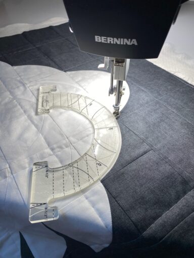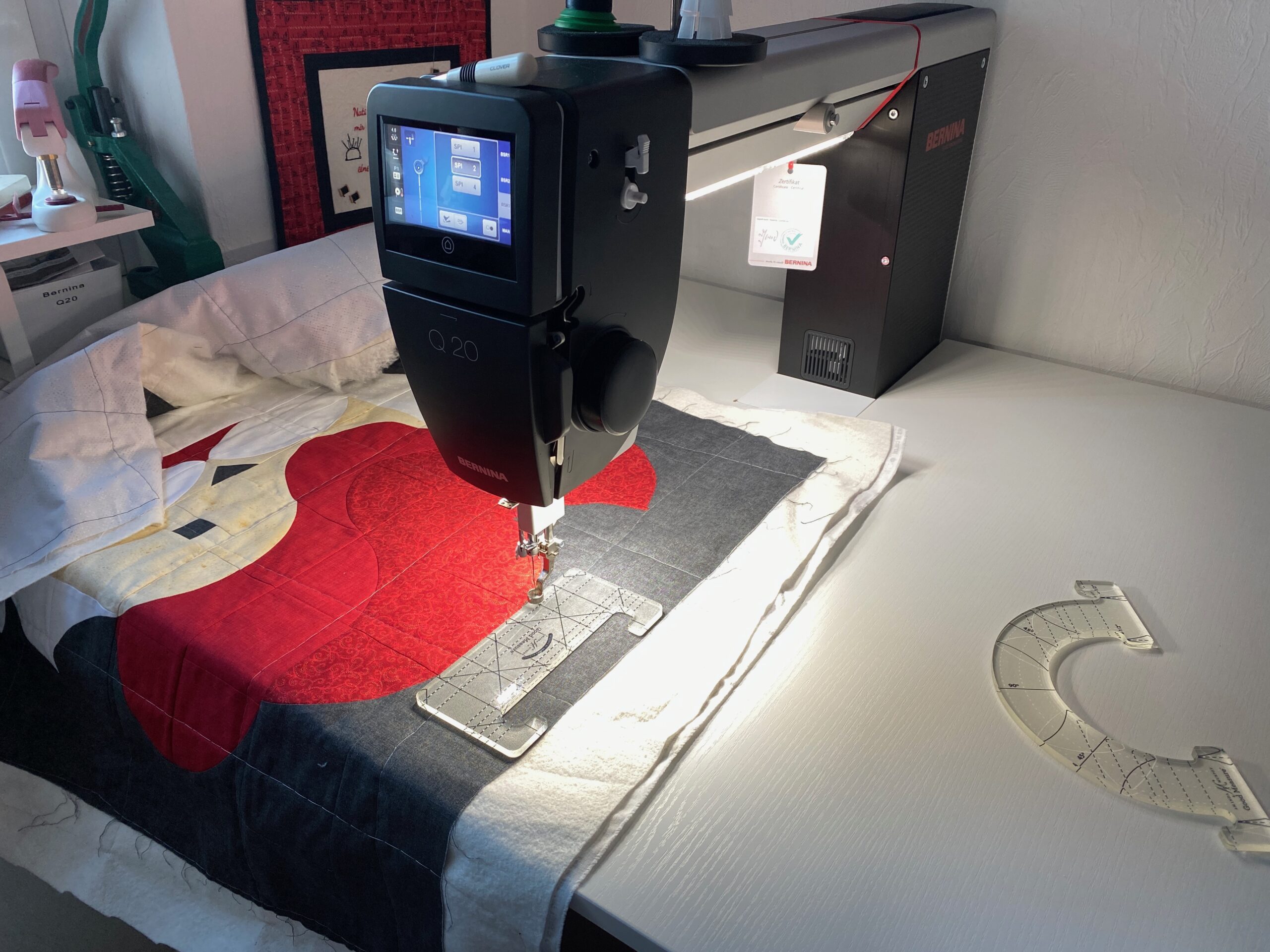 Zu Hause habe ich erst noch einen passenden Stoff für die Rückseite gesucht und auch gefunden. Auch Vlies war noch vorhanden und so konnte ich das Sandwich fertig stellen. Die Bernina Q20 abgedeckt, sauber gemacht, eine neue Nadel spendiert, passendes Garn rausgesucht und schon konnte es losgehen.
