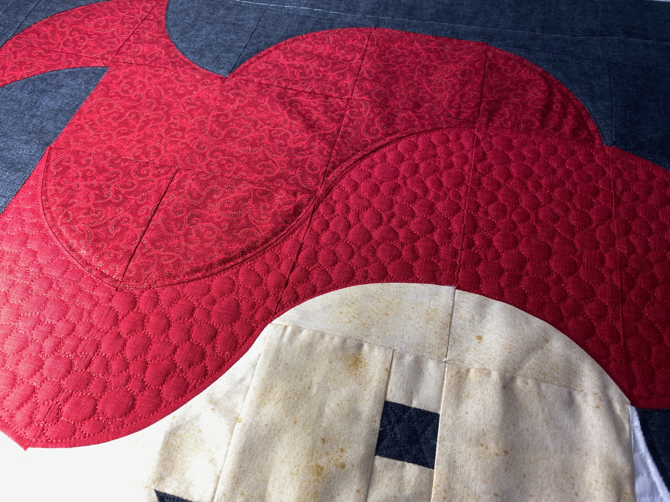 Dann die Mütze. Mein Santa hat ja keine weiße Krempe an der Mütze. Das hat mir nicht gefallen. Und so hellblau wie in der Vorlage ging gar nicht. Also hat er eine ganz rote Mütze bekommen. In der Krempe habe ich Bubbels gequiltet und im oberen gemusterten Teil ein wenig Mäander gemacht. Das sieht man bei der Musterung des Stoffes eh nicht. Aber ein Quilting musste schon sein. So sieht die Mütze „bewegter“ aus. Auf dem Foto ist aber der obere Teil noch nicht fertig. Dieses Zwischenstandsfoto habe ich tatsächlich vergessen. Die Bommel hat meinen Lieblingsstern bekommen.