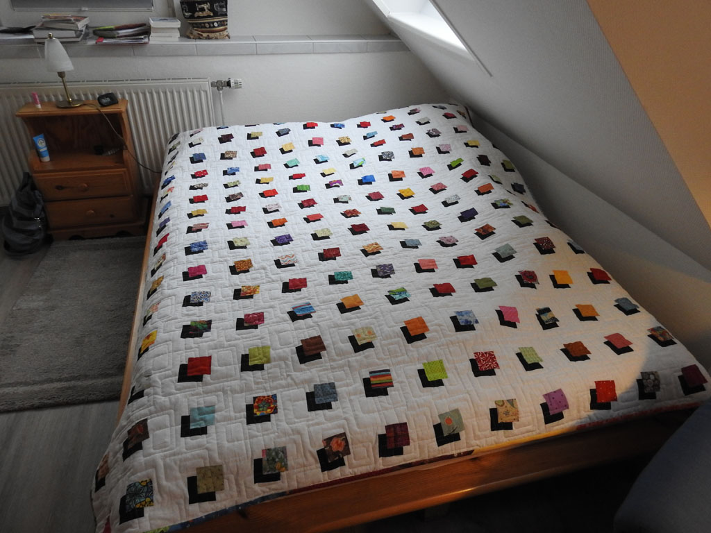 Betty bei mir und wir haben für unser Silvesterprojekt zugeschnitten. Da konnte ich auch einen Stoffabbau verzeichnen, weil wir nur aus meinem Vorrat geschnitten haben und Betty etliches an Quadraten und Bindingstreifen mitgenommen hat. Das macht insgesamt 17.542g verarbeiteten Patchworkstoff. Und hier habe ich tatsächlich ein Minus zu verzeichnen: – 7539g. Und das sehe ich sogar in meinem Schrank