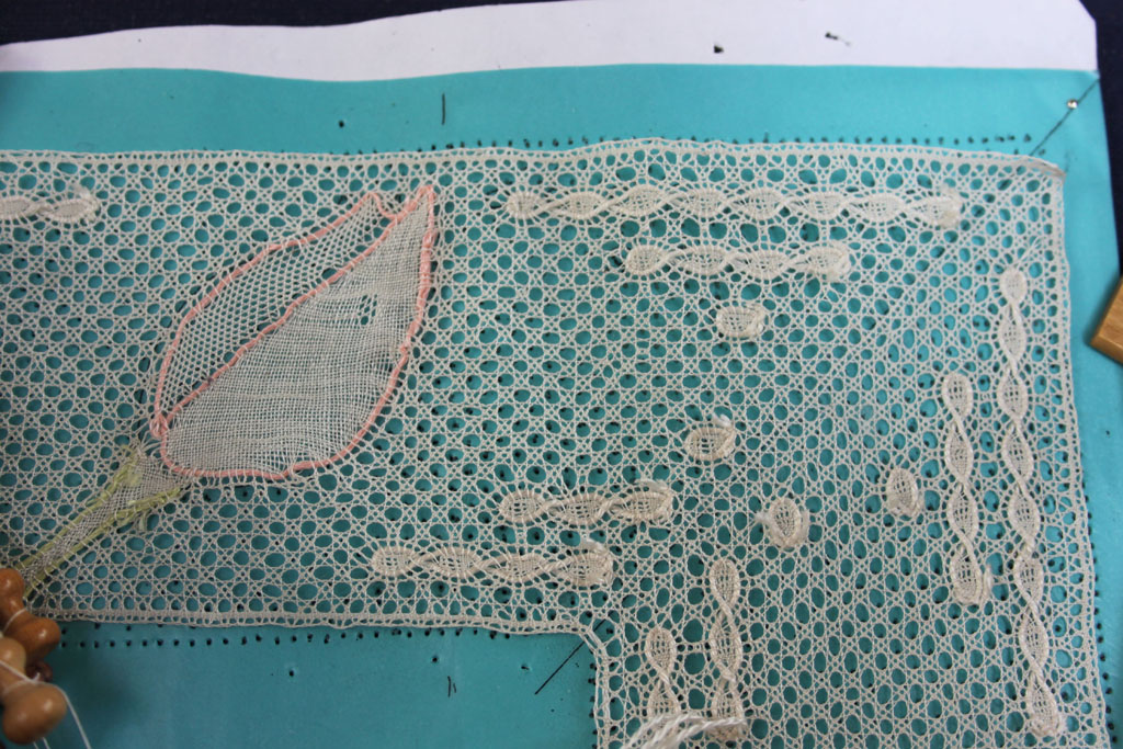 Als ich kürzlich für das Klöppelwochenende mein Klöppelbrett entstauben musste fand ich auf diesem noch einige fertig geklöppelte Gründe.