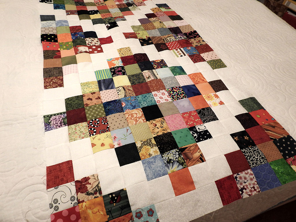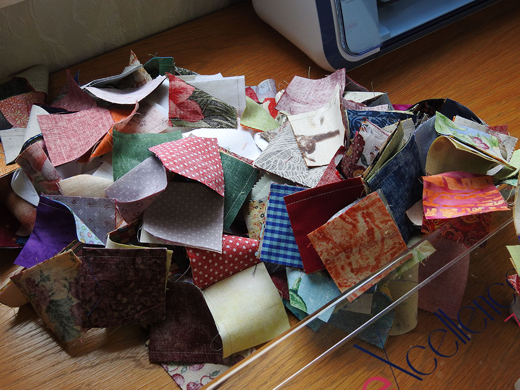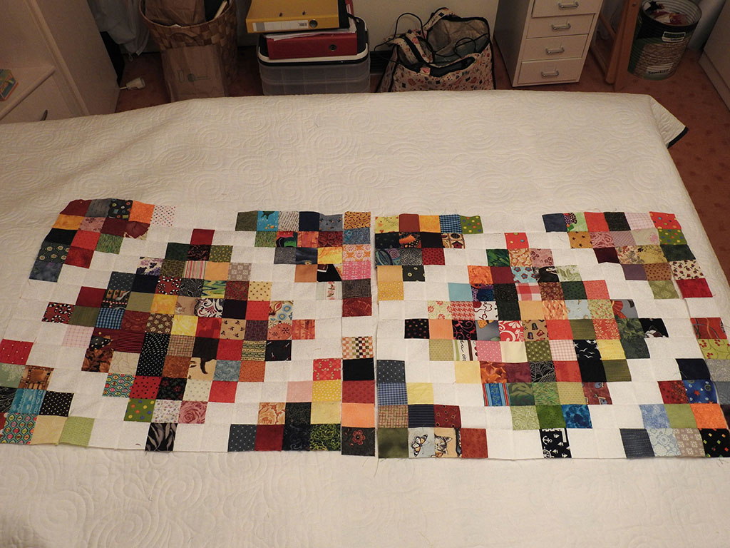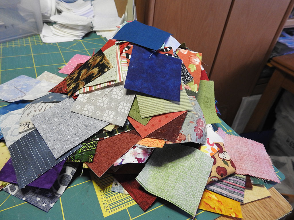 Restefestes wird etwas wegkommen, aber das werden ja nicht die Mengen sein. Aber immerhin greife ich dafür in meine Schnipsel, Streifen-, Quadrate und Sonstwasfürformen-Kisten. Das erste Projekt ist auch schon fast fertig. Mein Silvesterquilt ist auch gewachsen. So habe ich Stand gestern bislang 1.476 Quadrate aneinander genäht. Das schaut dann so aus:
