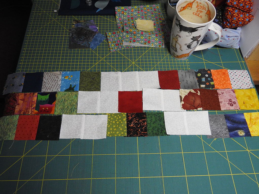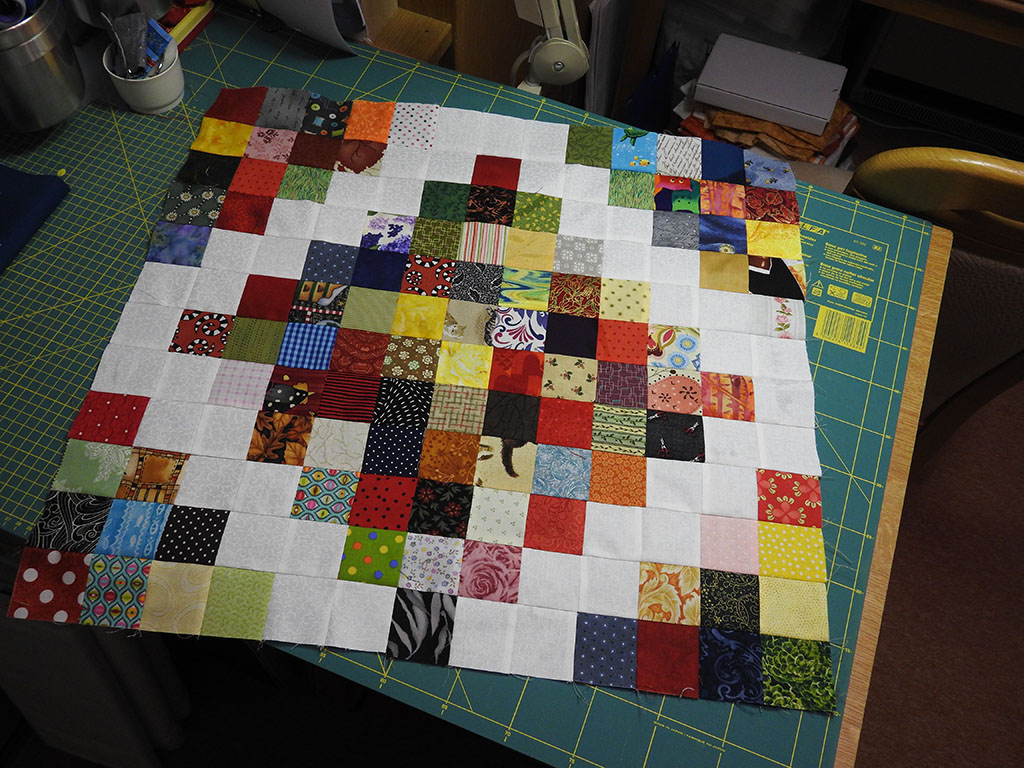 Bis ich mit den Randstreifen beginnen kann muss ich noch eine große Blockreihe – also 492 Quadrate – aneinandernähen. Aber ein Block ist auch schon fertig.