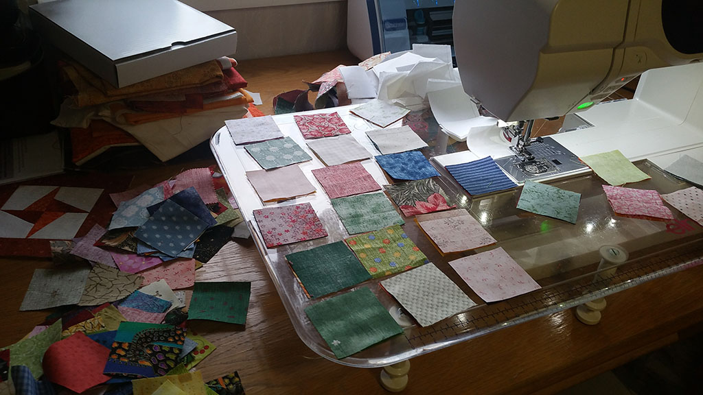 Aber dafür ist der zurechtgelegte Stapel vernäht. Einige weiße Quadrate sind auch vernäht.