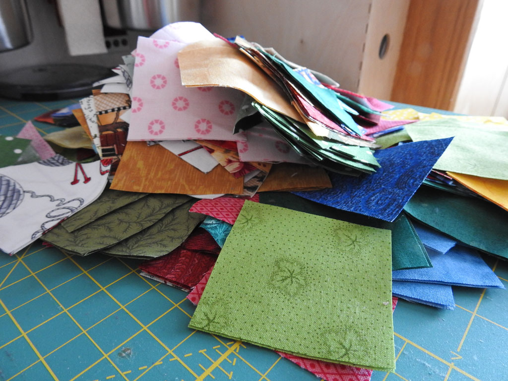 Schon das ganze Jahr über habe ich Reste zu Quadraten à 5cm oder 6cm und auch Streifen à 7cm zugeschnitten. Meine 6cm-Quadratekiste ist relativ gut gefüllt.