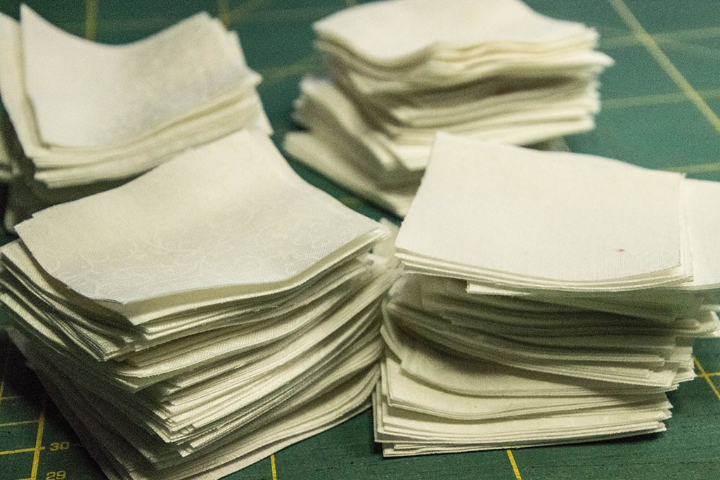 Aber dafür ist der zurechtgelegte Stapel vernäht. Einige weiße Quadrate sind auch vernäht.