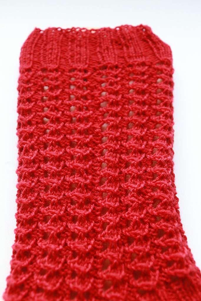 Aus eienm schönen unifarbenen rot habe ich mir luftige Socken gestrickt. Leider weiß ich nicht wlche Qualkität die Wolle ist. Die Banderole war unauffindbar 🙁