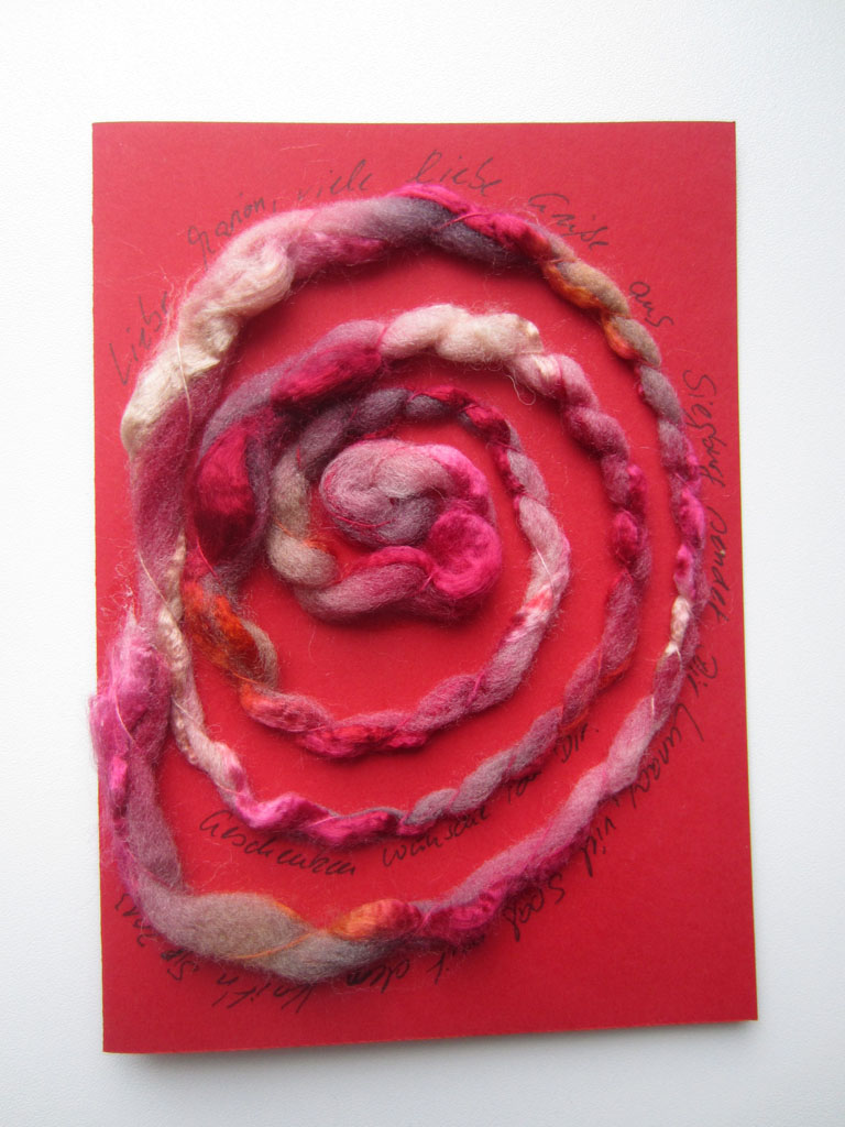 Filzwolle, ein katziges Buch, ein Handtuch von Rosina Wachtmeister (so schön!!!), ein Stückchen Stöffchen, Schoki und eine liebe Karte.